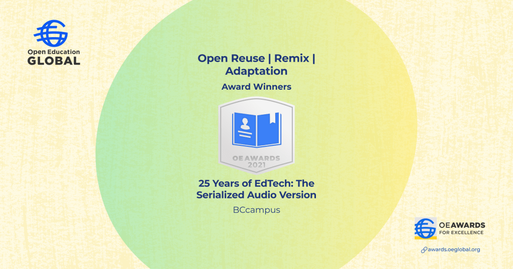 Last week, I learned that a podcast project I helped to produce won an award from the Open Education (OE) Global community. Clint and I shared a thank you message (in audio format, of course) for awarding the 25 Years of EdTech: The Serialized Audio Version project a 2021 Open Education Award of Excellence for Reuse/ Remix/ Adaptation.