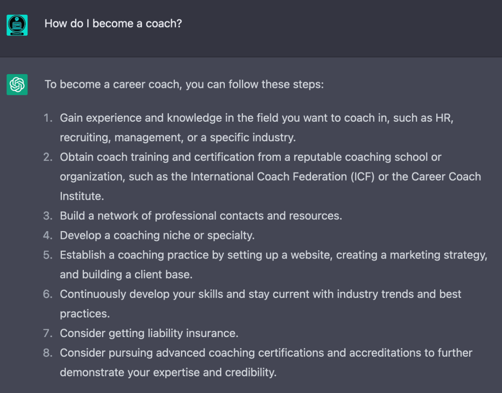 Based on the chatter and traffic on the OpenAI ChatGPT, I have no doubt folks are sourcing more than college essays or exam answers from this platform. There are probably professionals asking (or should be asking) questions to our robot friends. As a coach, I became curious to learn what information and advice was being offered about the field of coaching. So, I decided plug in the frequently asked questions (FAQs) I get from friends, family, colleagues, and potential coaching clients. Coaching FAQs: ChatGPT answers + my edits/adds to these responses.