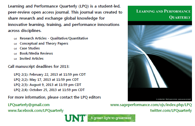 As the founding student editor for the Learning and Performance Quarterly (LPQ), an open access, peer-reviewed journal within the Department of Learning Technologies, I have gained a vast amount of insight in reviewing manuscripts, working with a diverse editorial board, supporting online distribution, and partnering with a number of contributing authors and academics. Both reviewing and editing for the LPQ and other academic journals, has improved my research and how I critically analyze academic publications. Being the editor has also not only challenged me to consider style and format, but has compelled me to assess other research methodologies.