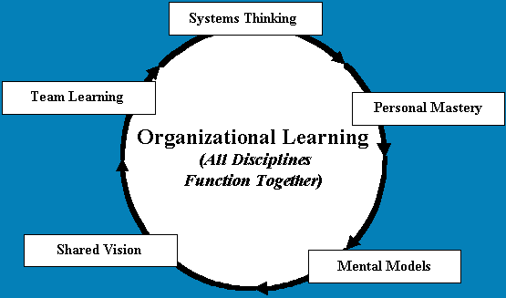 Systems Thinking – Senge (1990) identifies a learning organization as an organization that has the ability to creat alternative futures and possesses the following five disciplines: team learning, shared visions, mental models, personal mastery and system thinking.