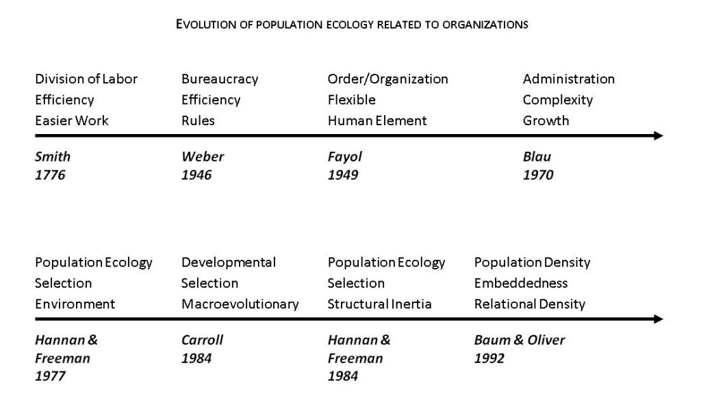 During last week’s organizational theory seminar, I helped lead a discussion about population ecology. As defined by Colyvan (2008), a population is a collection of individual of the same species that live together in a region. Population ecology is the study of populations (especially population abundance) and how they change over time.” Organizations are often classified into different “species” that coexits in an environment that change over time and space. These changes that occur at the environmental level, lead to selection of the best fitting organizations. In other words, the organizations who survive will be those who best fit the environment and are therefore selected. There are other arguments in population ecology that imply adaptation and sustainable systems may be alternative routes for survival. Here is a quick snap shot of the population theories we reviewed that explains the evolution: