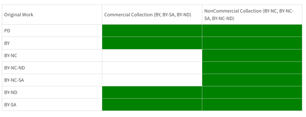 This chart identifies what licensing can and cannot be use commercially if utilizing any Creative Commons licensed materials. Beyond attribution and use, it is important to note the legal* rights and protections of works with CC BY licenses.