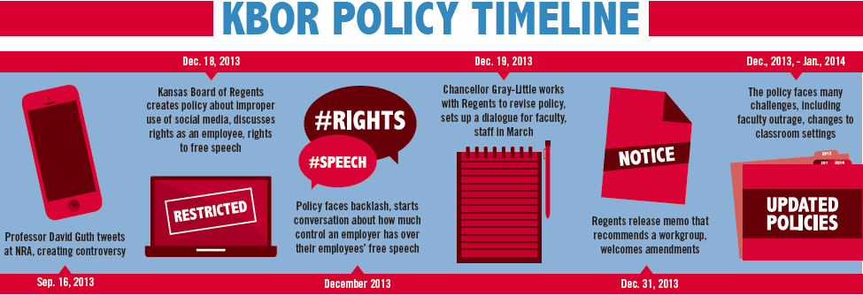 If you are interested in either research around policies and/or social media impact to organizations, specifically post-secondary education, then you most likely heard about the Kansas Board of Regents approval to amend their policy manual back in December 2013 to outline “improper use of social media by University of Kansas faculty.” If not, I have an article and infographic of the timeline of events for you: